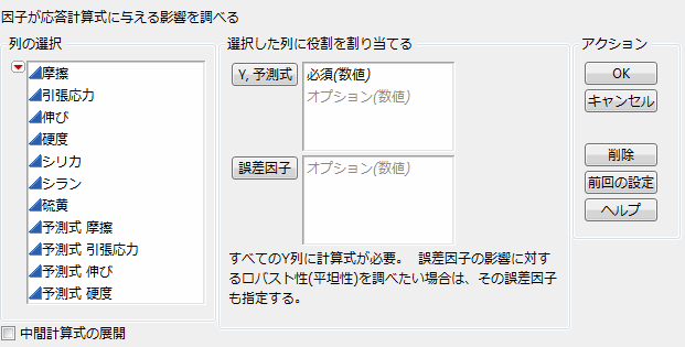 個別の分析プラットフォームからではなく、[グラフ]メニューからプロファイルを起動する場合は、計算式が含まれている列を[Y, 予測式]に指定します。ここで指定する計算式の列は、予め、分析プラットフォームなどを利用して保存しておく必要があります。