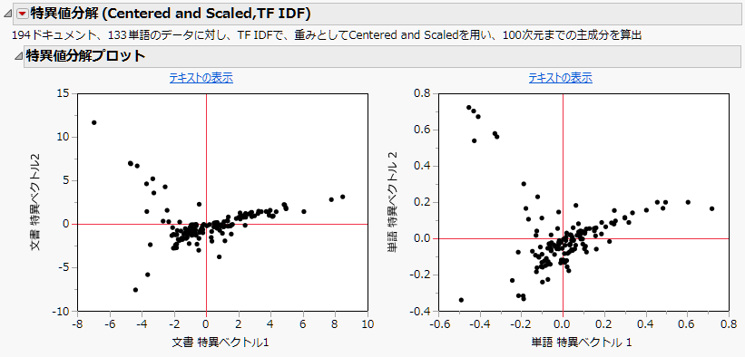 JMP Proでは、特異値分解に基づいて、似ている文書をトピックごとに分類することができます。特異値分解の結果をもとに、同じ単語が使われている文書や、1つの文書内で一緒に使われていることが多い単語を、クラスターにまとめることができます。また、潜在クラス分析によっても文書をクラスターに分けることができます。