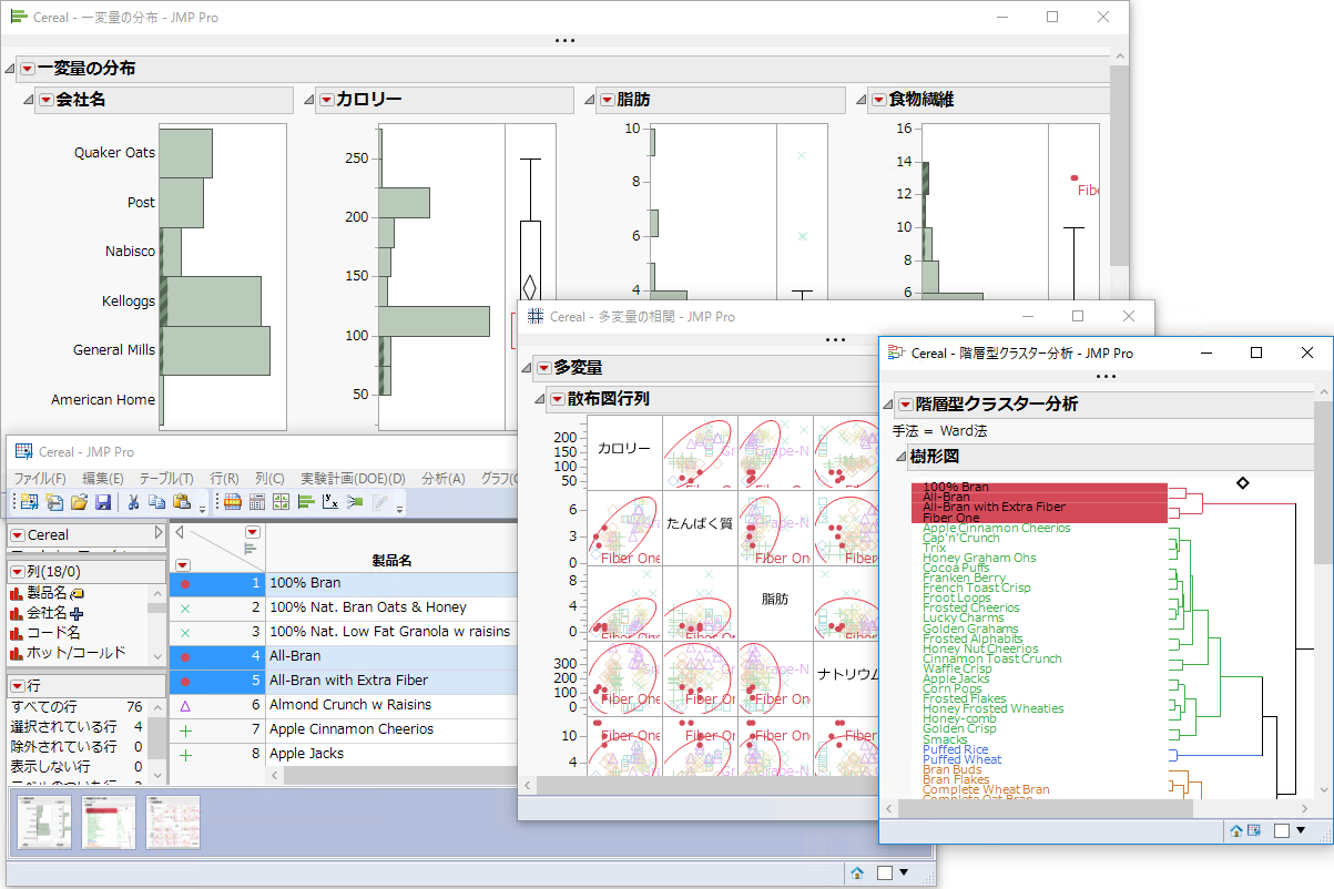 この章では、JMPとともにインストールされる「Cereal.jmp」サンプルデータテーブルを使って、統計分析を段階的に行っていきます。[一変量の分布]、[多変量]、[階層型クラスター]の各プラットフォームでデータを探索する方法を学びます。