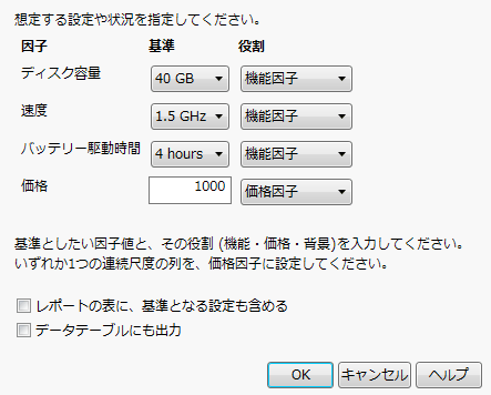 1回目の「支払意思額」の計算が完了すると、選択した基準値と役割が記憶されます。そのため、基準情報を一度入力するだけで、「支払意思額」の比較を何度も行うことができます。「価格」という名前の因子はないが、分析に使われている連続尺度の因子が1つしかない場合は、「支払意思額」ウィンドウにて、その因子に自動的に「価格因子」の役割が割り当てられます。実際の金銭的な価格以外にも、旅行時間や距離などの金銭的ではないコストも価格因子と考えられます。