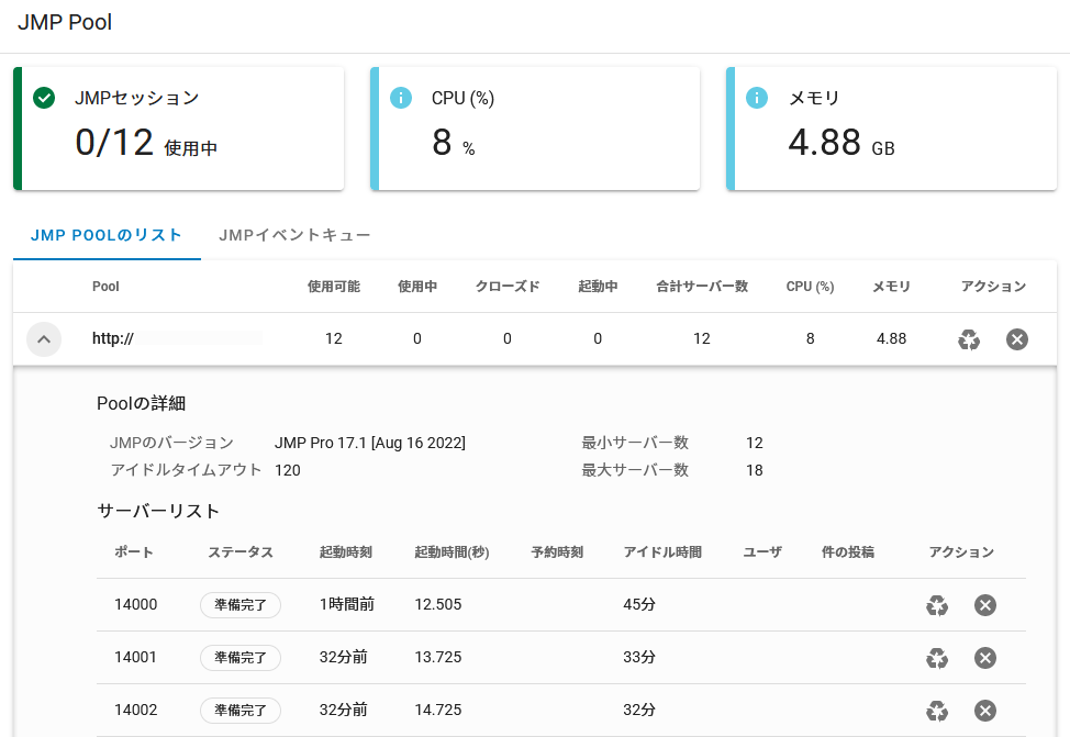 JMP LiveのJMP Poolでは、複数のポートで多数のJMPセッションが実行されます。JMP Poolのステータスやイベントは、[管理者]>[JMP Poolのステータス]でモニタすることができます。