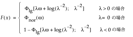 位置mu、尺度sigmaの対数正規分布のxにおける下側累積確率を戻す。累積分布関数は、次式のとおりです。