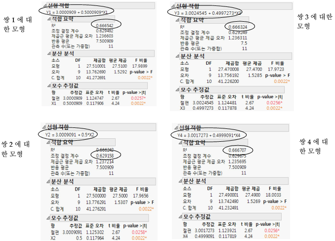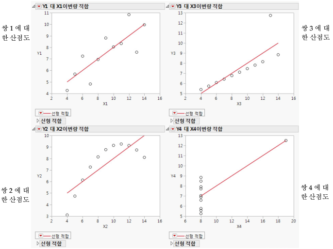 네 가지 모형과 R² 값이 거의 동일하다는 것에 유의하십시오. 각 사례에서 적합 모형은 기본적으로 Y = 3 + 0.5X이며 R² 값은 기본적으로 0.66입니다. 데이터 분석에서 위의 요약 정보만 고려하면 각 사례의 X와 Y 간 관계가 동일하다고 결론내릴 수 있습니다. 그러나 이 시점에는 데이터를 시각화하지 않았습니다. 결론이 잘못되었을 수도 있습니다.