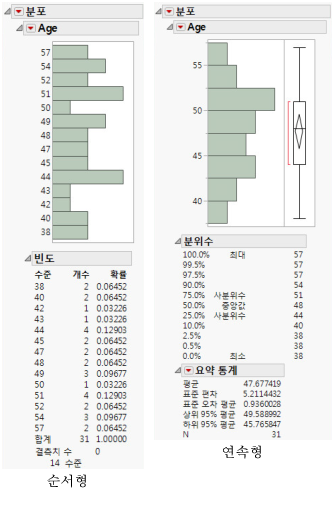 이 예의 단계를 반복하여(예: 모델링 유형 결과 보기 참조) 분포를 생성합니다. Age의 서로 다른 모델링 유형에서는 Age가 순서형일 때와 연속형일 때의 분포 결과를 보여 줍니다.