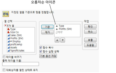 테이블 바꾸기를 선택하면 정렬된 값으로 새 테이블이 생성되지 않고 원래 데이터 테이블이 정렬됩니다. 원래 데이터 테이블에서 생성된 보고서 창이 열려 있으면 이 옵션을 사용할 수 없습니다. 관련 보고서 창이 열려 있는 상태에서 데이터 테이블을 정렬하면 데이터 중 일부가 보고서 창, 특히 그래프에 표시되는 방식이 변경될 수 있습니다.