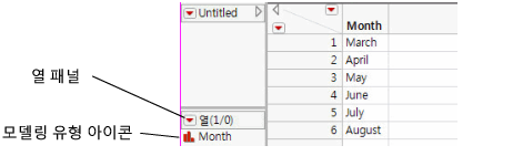 열 패널에서 열 이름 왼쪽에 있는 모델링 유형 아이콘을 확인합니다. 이전에는 연속형이었던 Month가 이제 명목형임을 반영하여 변경되었습니다. 열 이름 입력의 Column 1과 완료된 Month 열의 Month에 표시된 모델링 유형을 비교해 보십시오. 이 차이점은 중요하므로 열 정보 보기 또는 변경에서 자세히 설명합니다.