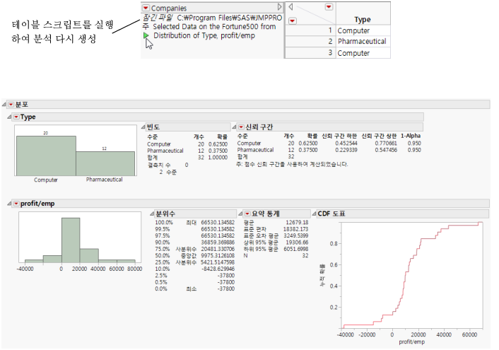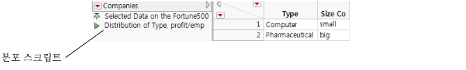 이 분석을 저장하려면 분포의 빨간색 삼각형 메뉴에서 스크립트 저장 > 데이터 테이블에를 선택합니다. 테이블 패널에 새 스크립트가 나타납니다.