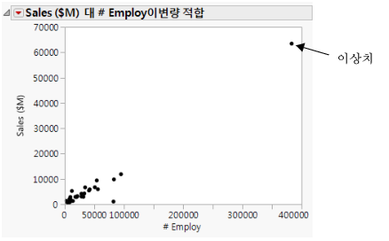 팁: 점을 제외하면 분석은 해당 데이터 점 없이 다시 계산되지만 해당 데이터 점이 산점도에서 숨겨지지는 않습니다. 산점도에서도 해당 점을 숨기려면 점을 선택한 후 행 > 숨기고 제외하기를 선택하십시오.