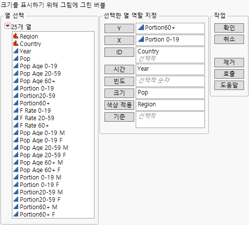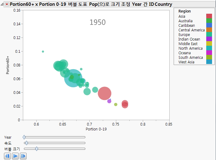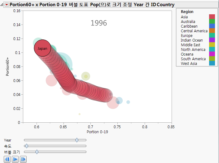 버블 그림의 전체 연도 범위에 애니메이션을 적용하려면 재생/일시 중지 버튼을 클릭하십시오. 시간이 지나면서 Portion 0-19의 비율이 감소하고 Portion60+의 비율은 증가합니다.