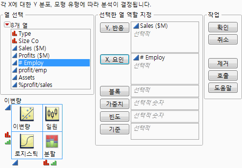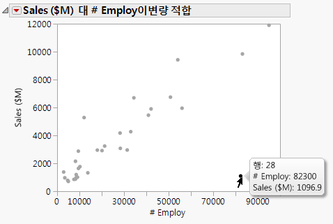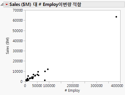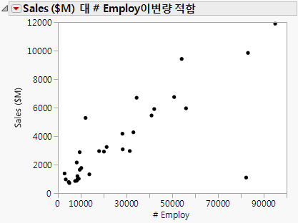이 예에서는 특정 회사 그룹의 매출액과 직원 수가 포함된 Companies.jmp 데이터 테이블을 사용합니다.