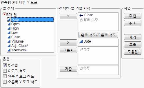 참고: 시간에 따른 데이터 그림을 생성하려는 경우 그래프 빌더, 버블 그림, 관리도 및 계량형 차트를 사용할 수도 있습니다. 그래프 빌더 및 버블 그림에 대한 자세한 내용은 Essential Graphing 설명서의 "Graph Builder" 장에서 확인하십시오. 관리도 및 계량형 차트에 대한 자세한 내용은 Quality and Process Methods 설명서의 "Control Chart Builder" 장 및 "Variability Gauge Charts" 장에서 확인하십시오.