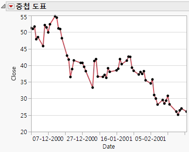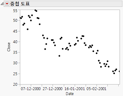 이 예에서는 3개월 동안의 주가에 대한 데이터가 포함된 Stock Prices.jmp 데이터 테이블을 사용합니다.