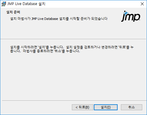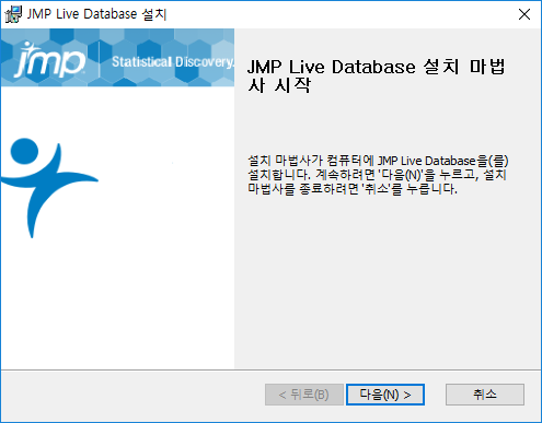 JMP Live Database 설치 관리자(JMPLiveDatabase.msi)를 다운로드한 위치로 이동합니다. 파일을 두 번 클릭하여 실행합니다.