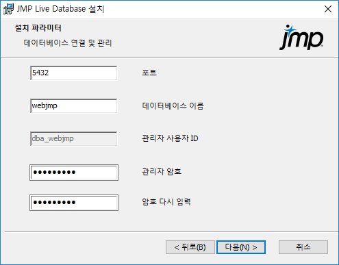 데이터베이스 이름: JMP Live가 사용하는 기본 데이터베이스의 이름입니다. 이 설정은 webjmp로 두는 것이 좋습니다. 관리자 사용자 ID를 dba_webjmp에서 변경할 수 없습니다.