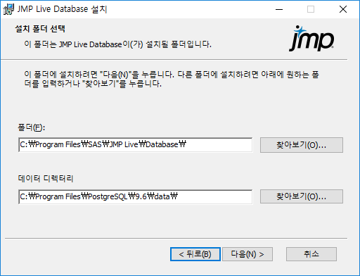 JMP Live 데이터베이스 및 PostgreSQL 데이터베이스를 설치할 위치를 지정합니다.