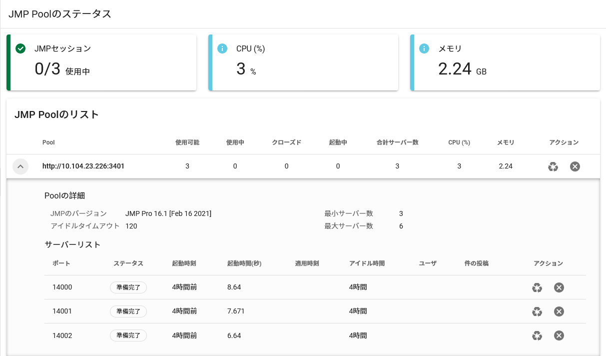 JMP 풀에는 서로 다른 포트에서 실행 중인 여러 JMP 세션이 있습니다. 관리자 > JMP 풀 상태에서 JMP 풀 상태를 모니터링할 수 있습니다. 해당 풀의 JMP 세션을 보려면 웹 주소 옆의 회색 화살표를 클릭합니다.