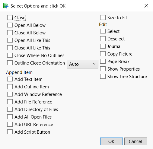 . This displays a window, as shown in Figure 9.3, with check boxes for commands and options so that you can select multiple actions at the same time. You can also do the same for the menu under a red triangle menu.