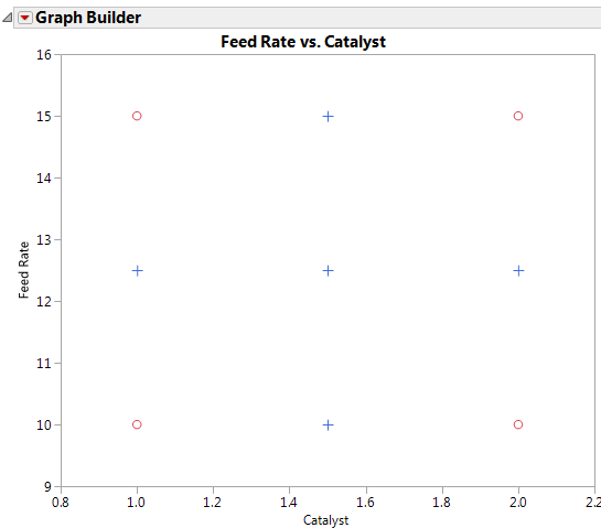 The “+” points in the graph of Feed Rate versus Catalyst are the added axial and center points. The axial points are on the face of the design space. Increasing or decreasing the axial value in the augmentation of the design would move the axial points beyond or within the design space.