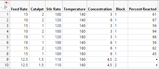 1. Select Help > Sample Data Library and open Design Experiment/ Reactor 8 Runs.jmp.