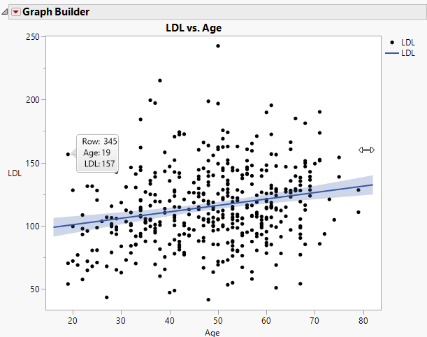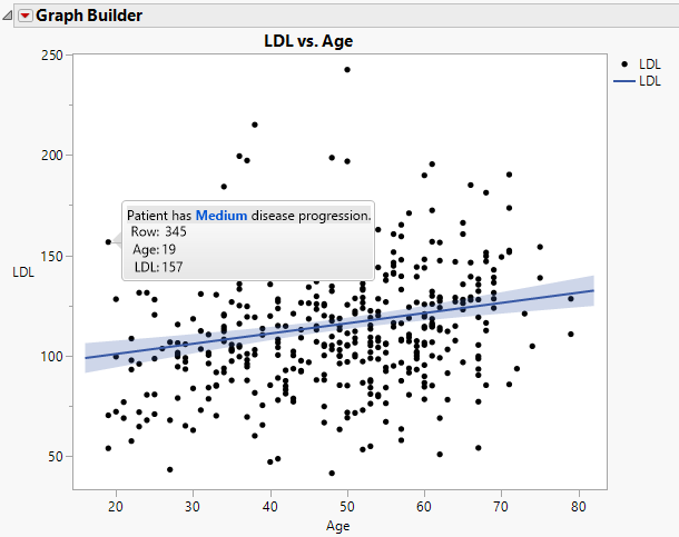 For the data point in row 345, you can see the row number, age of the person, and their LDL measurement. You want to change what appears in the hover labels, as follows: