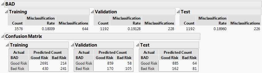 The Training, Validation, and Test sets show misclassification rates between 18% and 19%. The confusion matrices for all of the sets suggest that the largest source of misclassification is the classification of Bad Risk customers as Good Risk customers.