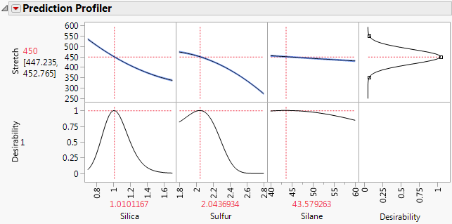 The value of Stretch that maximizes the desirability function is 450. One combination of factor level settings that results in a predicted Stretch of 450 is Silica = 1.0101, Sulfur = 2.0437, and Silane = 43.5792.