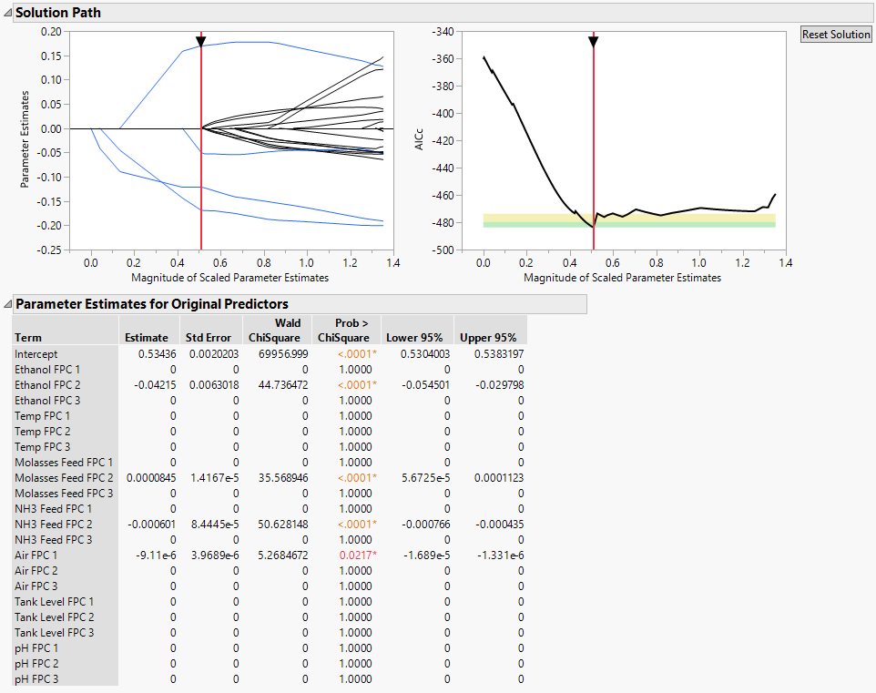 The Generalized Regression report shows that Yield is significantly affected by certain components of Ethanol, Molasses Feed, NH3 Feed, and Air. The RSquare for the model is 0.732545. By using FDE to perform dimension reduction on the functional processes first, you greatly reduce the number of variables, while still retaining the ability to build a reasonable prediction models.