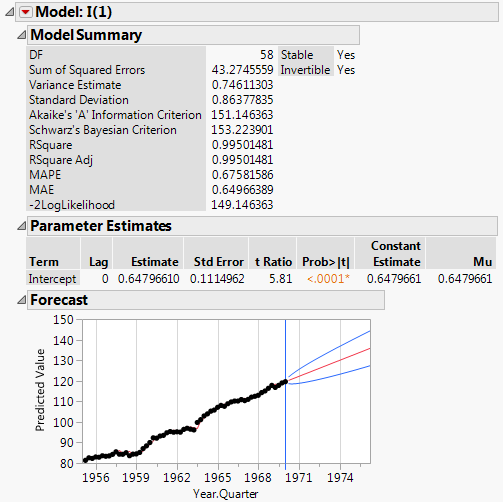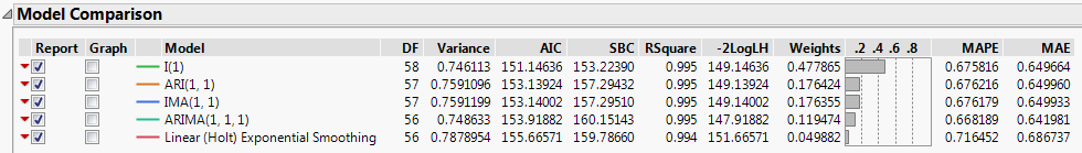 The Model Comparison Table is sorted such that the best fitting model, according to the AIC criterion, is at the top of the list. In this case, the ARIMA(0,1,0) model (denoted I(1) in the report) best fits the original time series. It should also be noted that although the I(1) model is “best,” all of the models have extremely similar values for the fit statistics. They could all be considered appropriate.