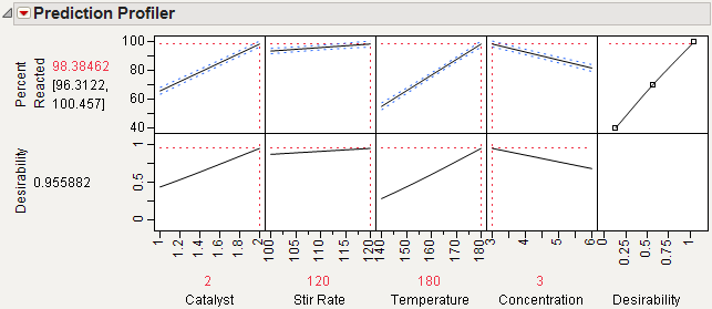 The prediction profile plot shows that the maximum percent reaction occurs at high Catalyst, Stir Rate, and Temperature and low Concentration. At these extreme settings, the estimate of Percent Reacted is 98.38.