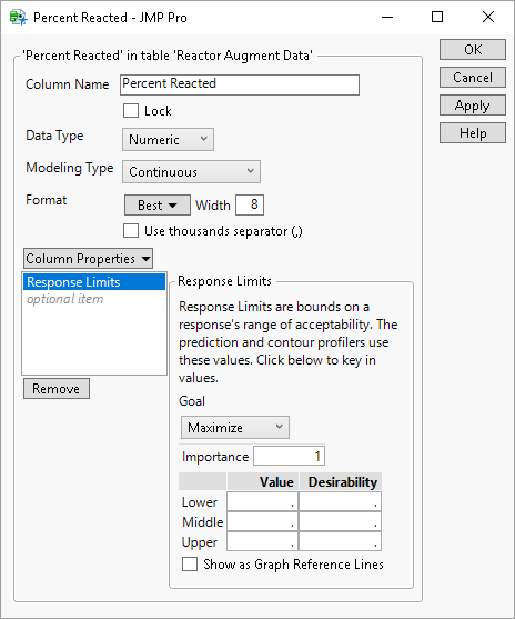 Figure 6.5 Change the Response Limits Column Property for the Percent Reacted Column