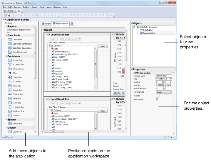 The toolbar provides quick access to many features, such as aligning objects and inserting common display boxes. (Select View > Toolbars > Application Builder to show the toolbar.)