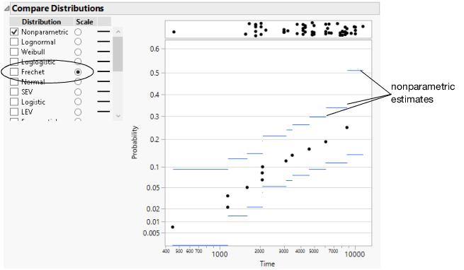 In the initial Compare Distributions report, the probability and time axes are linear. But suppose that you want to see distribution estimates on a Fréchet scale.1