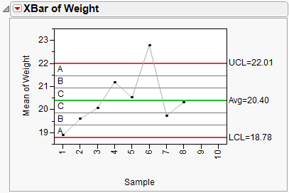 Shows or hides the zone lines. The zones are labeled A, B, and C as shown here in the Mean plot for weight in the Coating.jmp sample data. Control Chart tests use the zone lines as boundaries. The seven zone lines are set one sigma apart, centered on the center line.