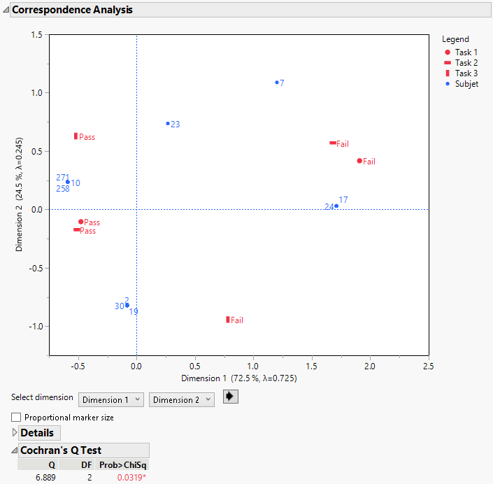 The correspondence plot shows the similarity between Task 1 and Task 2 as the Pass and Fail outcomes cluster together. However, Task 3 is farther away from Tasks 1 and 2. Cochran’s Q test statistic of 6.889 has an associated p-value of 0.0319. This p-value supports the rejection of the hypothesis that the pass rates are the same across all tasks at a 0.05 significance level.