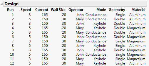 Notice that three of these factors are continuous: Speed, Current, and Wall Size. Four are categorical: Operator, Mode, Geometry, and Material. Each of these categorical factors has two levels.