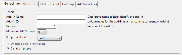 Note: Add-ins were introduced in JMP 9, so no prior versions are supported. And when saving an application as an add-in, select 10 or 11 as the JMP minimum version.