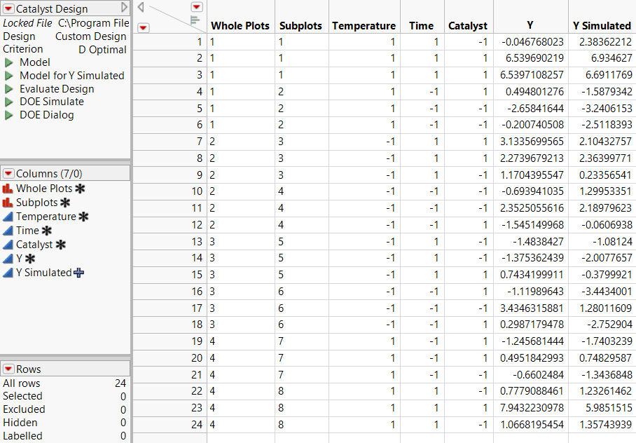 Construct the DesignIf you prefer to skip the steps in this section, select Help > Sample Data Library and open Design Experiment/Catalyst Design.jmp. In the Catalyst Design.jmp data table, click the green triangle next to the DOE Simulate script. Then go to Fit the Model.