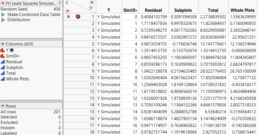 In your simulations, you replace the column Y Simulated, which you used to run your model, with a new instance of the column Y Simulated, which generates a new column of simulated values for each simulation. The column on which you right-clicked and that appears as selected, Var Component, is simulated for each effect listed in the Parameter Estimates table.