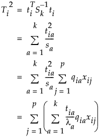 The T2 contributions for a PCA or PLS model with p variables and k components are calculated as: