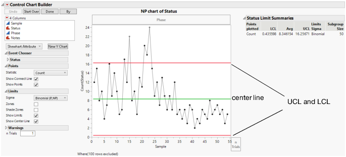 Note: You can hide the lower control limits on dispersion, attribute, and rare event charts by deselecting the Show Lower Control Limit preference in File > Preferences > Platforms > Control Chart Builder.