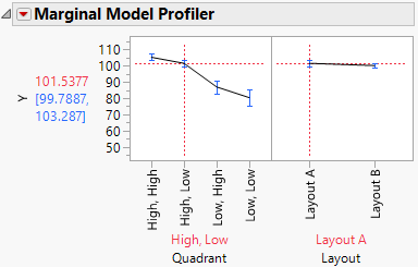 2. In the Profiler plot, compare the predicted values for Y across the quadrants by first setting the vertical red dotted line at Layout A and then at Layout B.