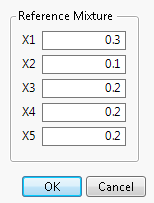 The Cox Mixture option opens a window where you enter the reference mixture. If you enter components for the reference mixture that do not sum to one, then the components are proportionately scaled so that they do sum to one. The rescaled mixture is shown in the report as the Reference Mixture. The component effects also appear in the report. A Cox component effect is the difference in the predicted response as the factor goes from its minimum to maximum values along the Cox effect direction.