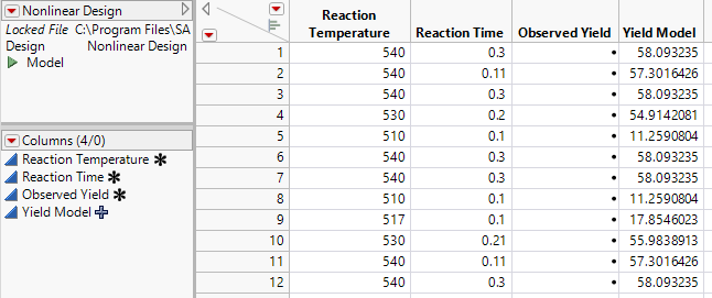 Now that you have created your design table, run your experiment, and record the responses in the Observed Yield column. The data table Reaction Kinetics.jmp, found in the Design Experiment folder contains observed results for the design.