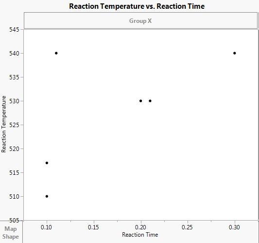 In this example, the values 510 and 540 for Reaction Temperature and 0.1 and 0.3 for Reaction Time were specified using the Coding column property. Alternatively, you can specify a reasonable range of values directly in the Factors outline.