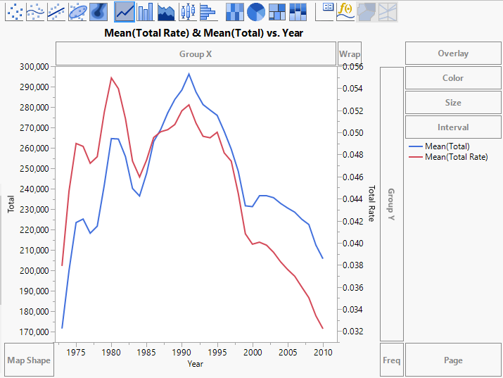 An axis for Total Rate is added on the right, and the axes rescale to show both sets of values. You can now see relationships between the two measures. For example, both measures began to decrease in 1991.