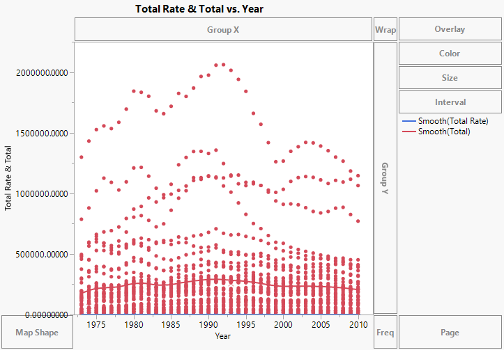 The CrimeData.jmp sample data table contains data on various types of crime for the 50 US states yearly, from 1973 to 2010. The Total column sums the number of incidents, and the Total Rate column gives a population-adjusted rate. You want to show these two variables on a single chart.
