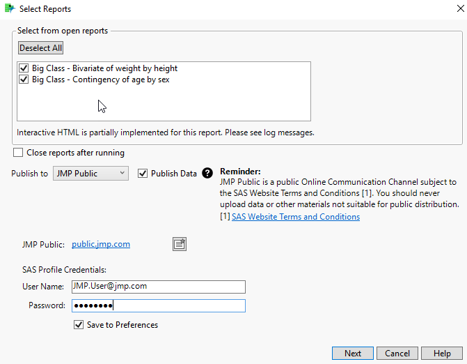 The File > Publish option creates a web page in which reports, descriptive text, and graphics are displayed. The web page, graphics, and support files are saved in the directory that you specify so that you can zip the files and send them to another user. This feature is particularly helpful for non JMP users.