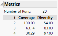 The Metrics outline indicates that Strength 2 coverage is 100%. This means that all permissible two-factor combinations are represented in the design. The design also covers 65% of all three-factor combinations.