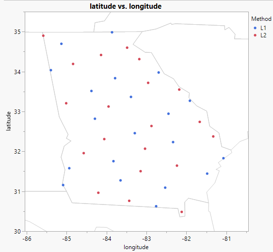 In the following example, you determine the longitude and latitude for the US state of Georgia, define the shape of the state, then create the design. The design will provide the location and the sampling method for each of your 40 samples.