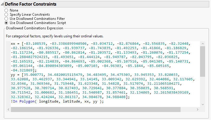 2. Go to your script window and copy the xx and yy matrices from your script log. Paste this into the Disallowed Combinations Expression text box.